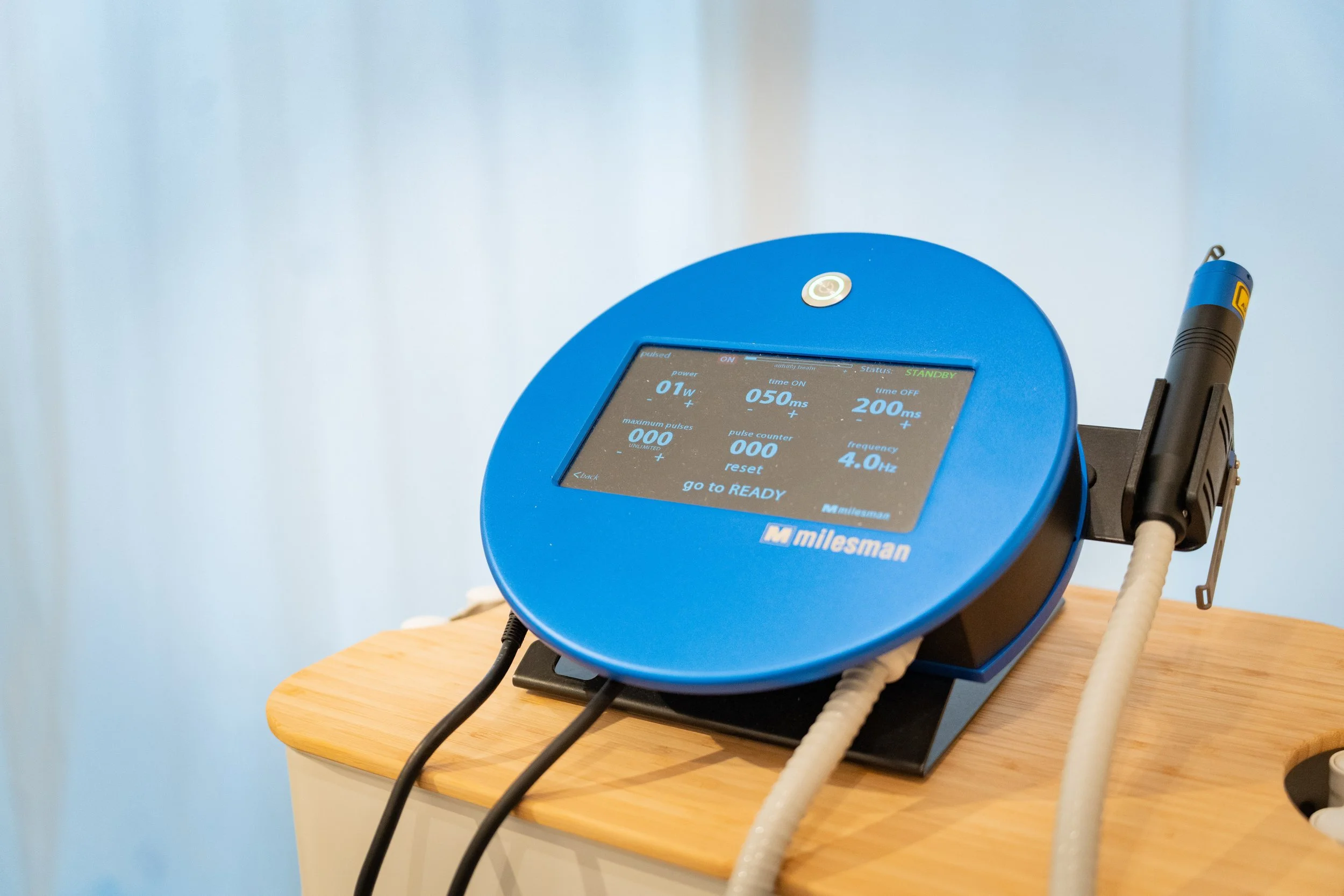 Onze Blauman-laser werkt met een precieze blauwe diodelaserstraal (450 nm) die drie unieke effecten combineert: